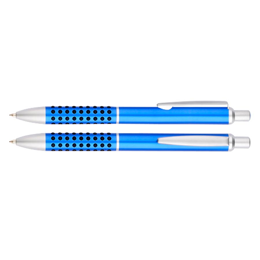 Bolígrafo metálico satinado modelo «Caterpillar», con lunares de goma negra que brindan una suave sensación de masaje dactilar al escribir. Escritura azul.