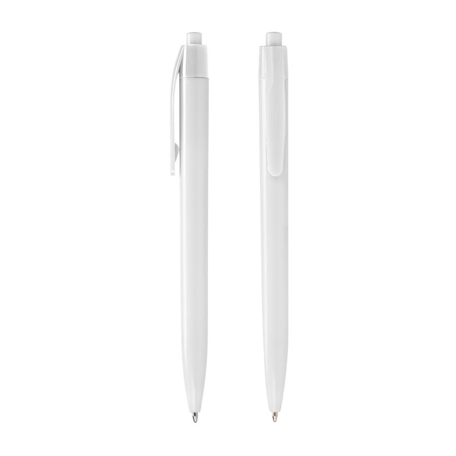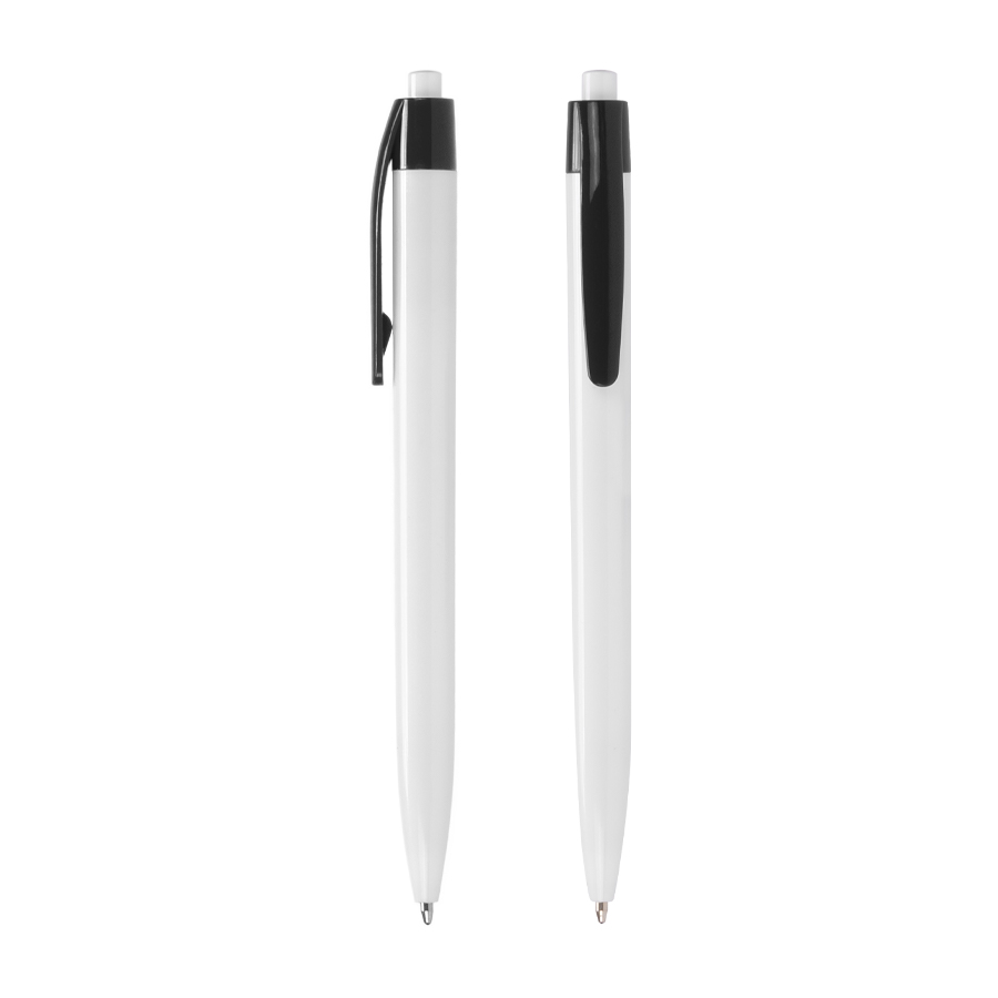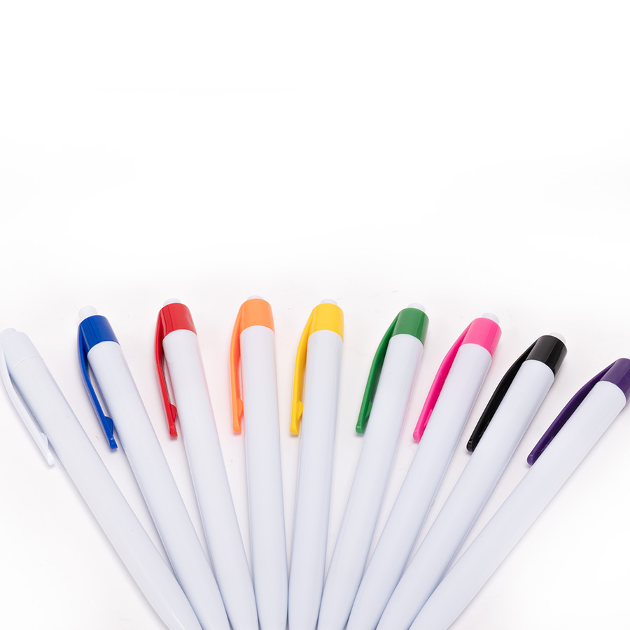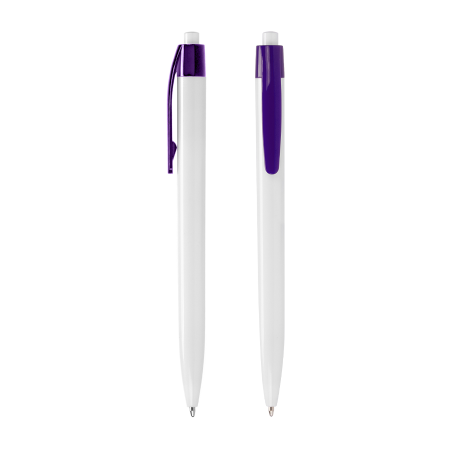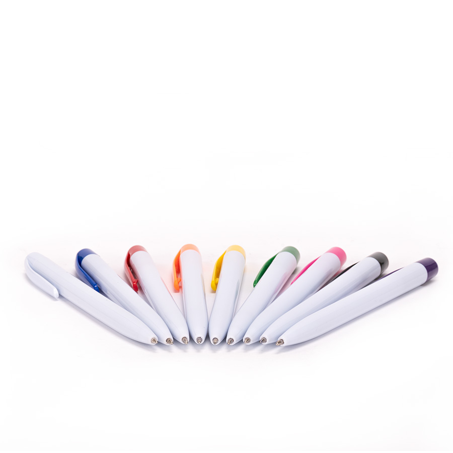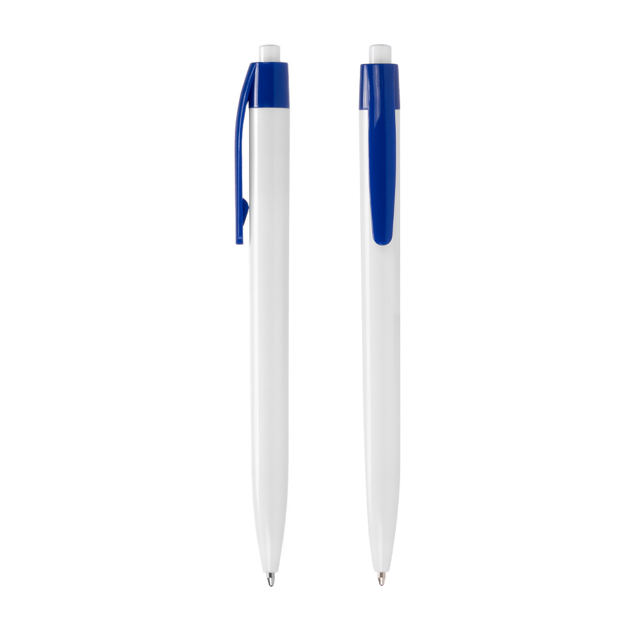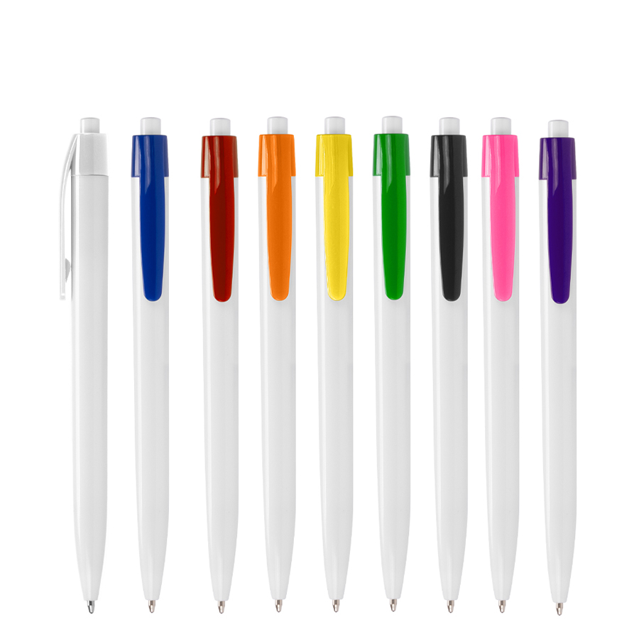 Bolígrafo plástico cuerpo blanco y clip de color. Escritura azul.