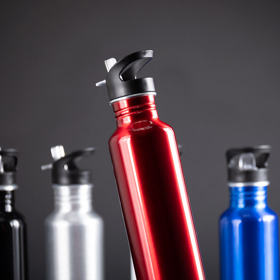 Sport Bottle botella metálica de Aluminio modelo «BUZZ», con tapa rosca de plástico PP, dosificador retraíble con boquilla translúcida y anillo de silicona, anti-derrame. Producto BPA FREE, para el contacto con líquidos y alimentos. Capacidad 750ml. Presentación en bolsa PP + caja de regalo de cartón lacado color plata. IMPORTANTE: esta botella NO es térmica, apta sólo para líquidos fríos.