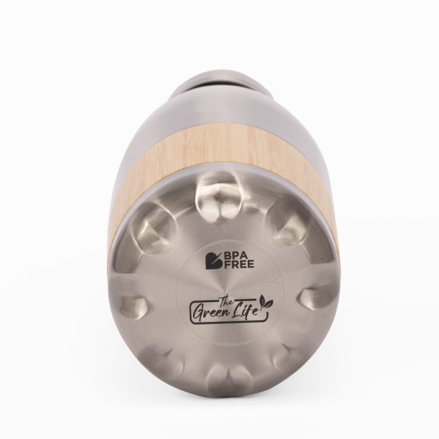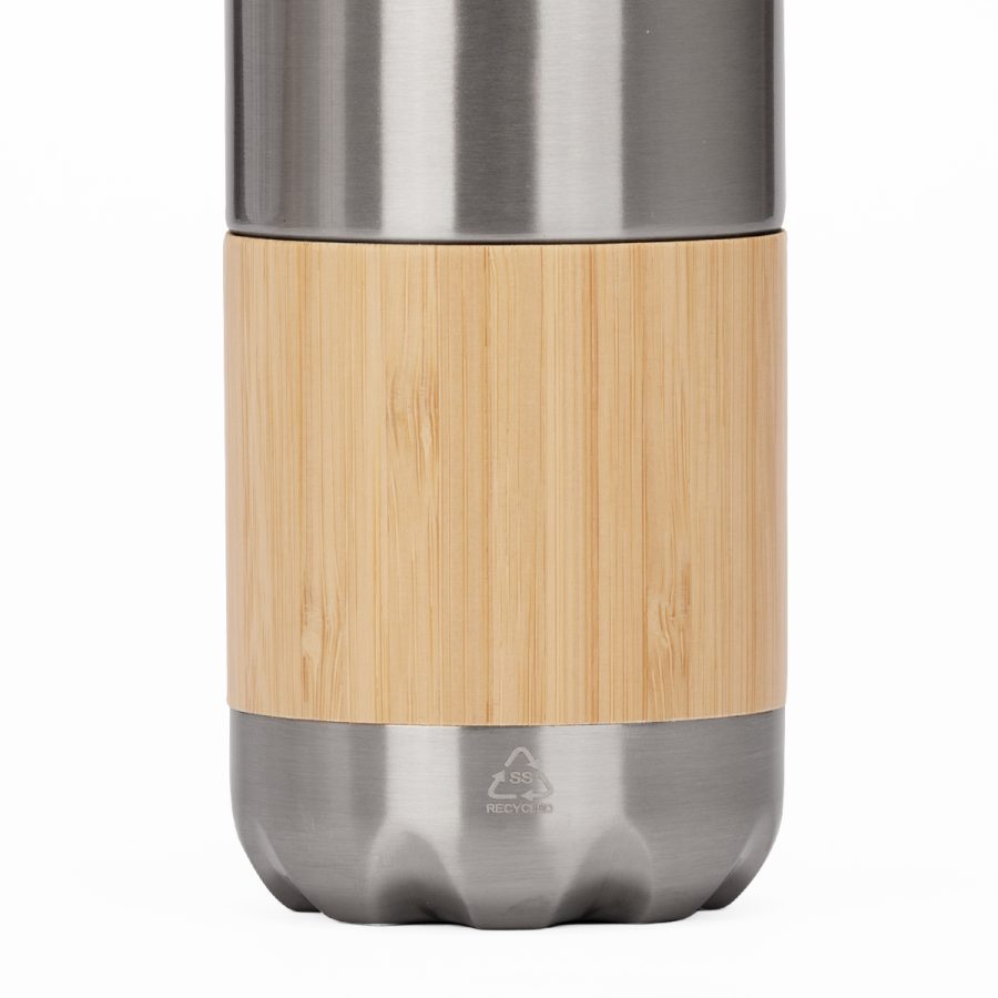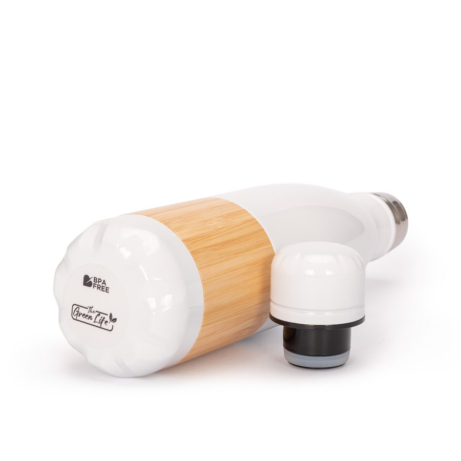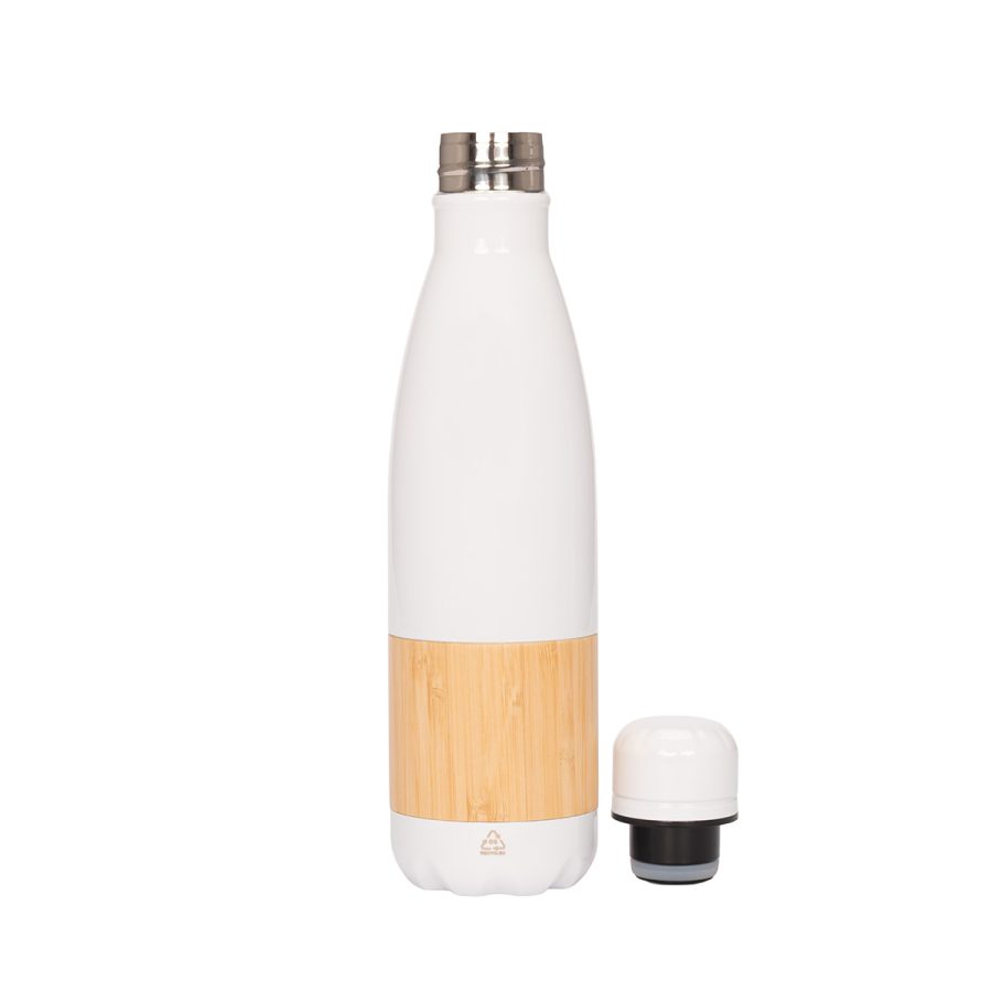 ESTOCOLMO es una botella de acero inoxidable reciclado con un diseño limpio y atemporal. Con capacidad de 500 ml y doble pared para conservar la temperatura de tus bebidas, combina practicidad y elegancia en cada detalle. Su cuerpo blanco brillante y el elegante recubrimiento de bambú aportan una estética natural que conecta con hábitos responsables. La tapa de rosca metálica asegura un cierre hermético y duradero. ESTOCOLMO es ideal para marcas que desean proyectar sobriedad, sostenibilidad y estilo con cada sorbo.