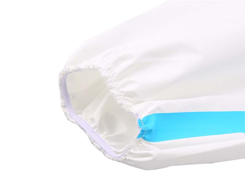 Coverall full protección, en tela gruesa nonwoven impermeable «Melt-Blown» de 120g/m2, para uso quirúrgico, transporte e industrial. Proporciona protección de fluídos líquidos y gaseosos, polvo en suspensión, sustancias dañinas, virus y bacterias. Se recomienda usar encima de la ropa de vestir.
