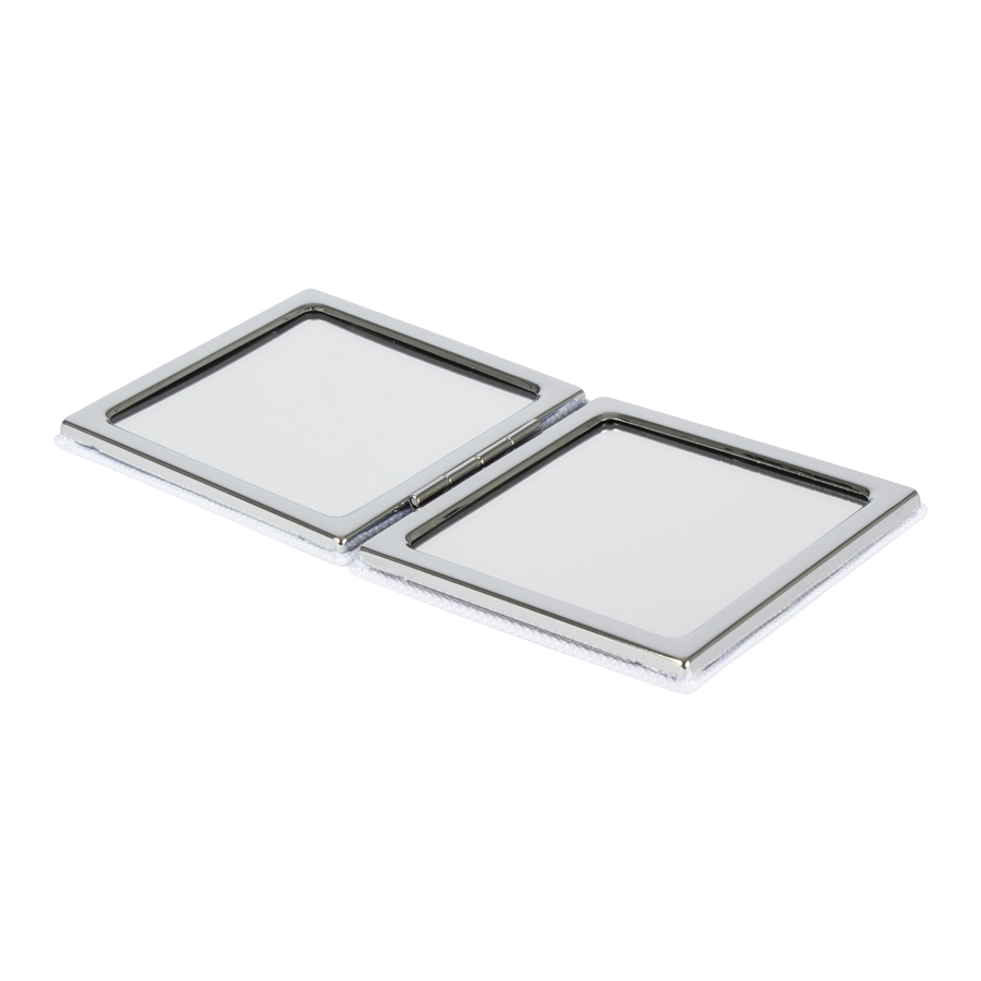 Espejo metálico cuadrado doble, con 2 tapas exteriores recubiertas en poliéster color blanco, para Sublimación. Contiene un espejo normal y el otro con aumento. Sistema de cierre magnético. Presentación en bolsa PP translúcido.