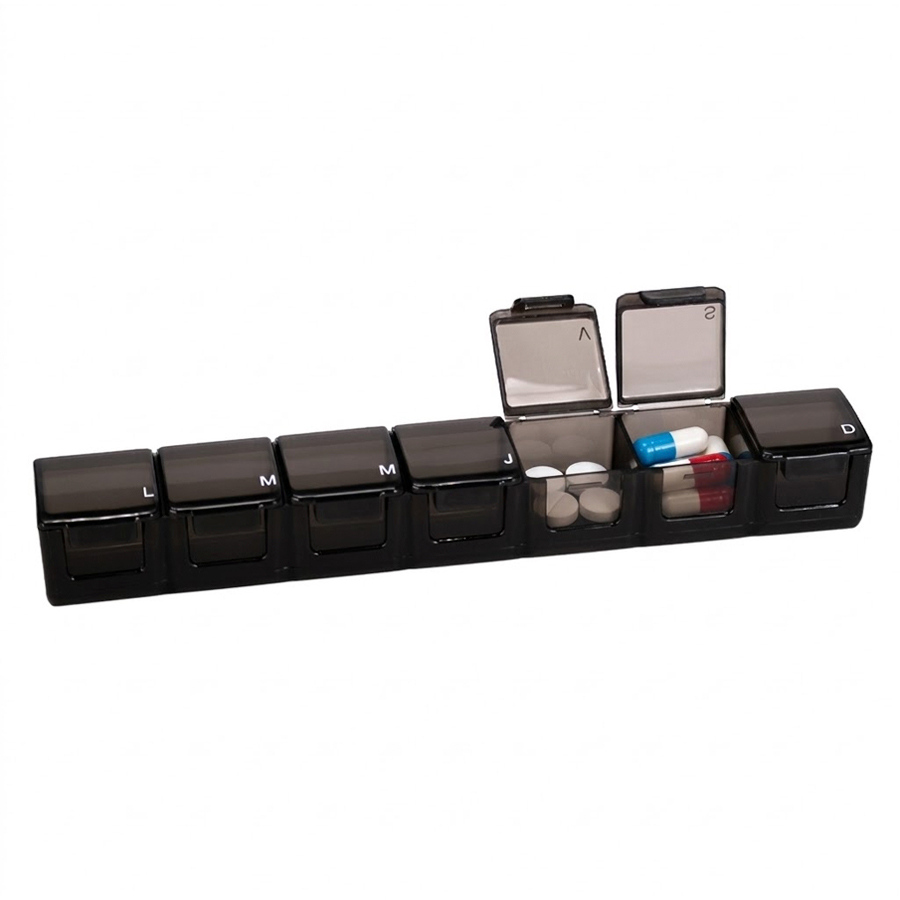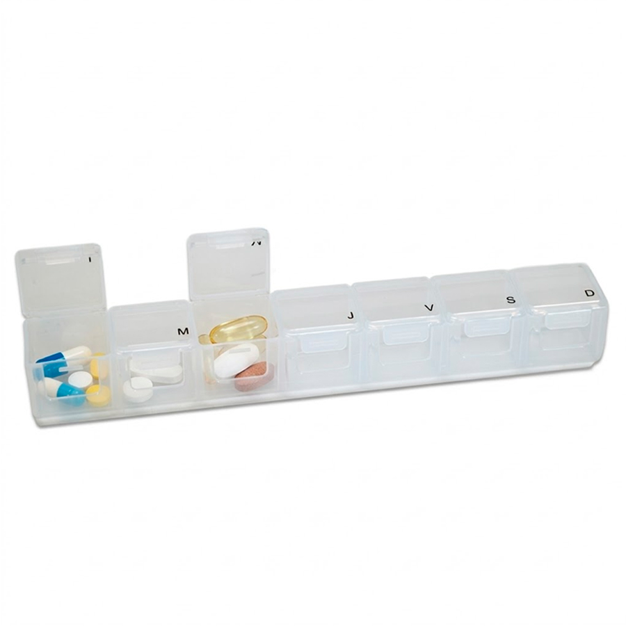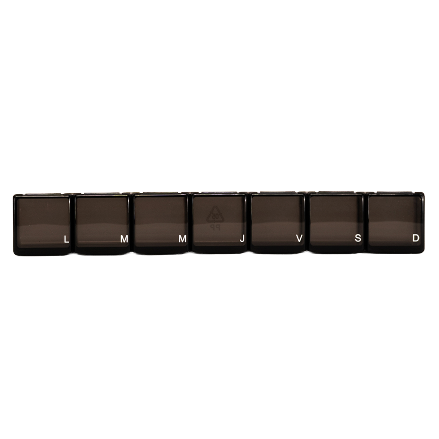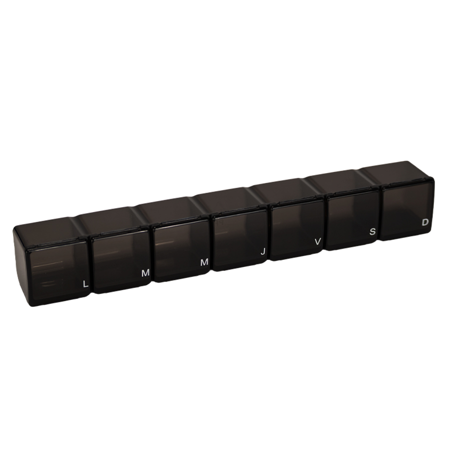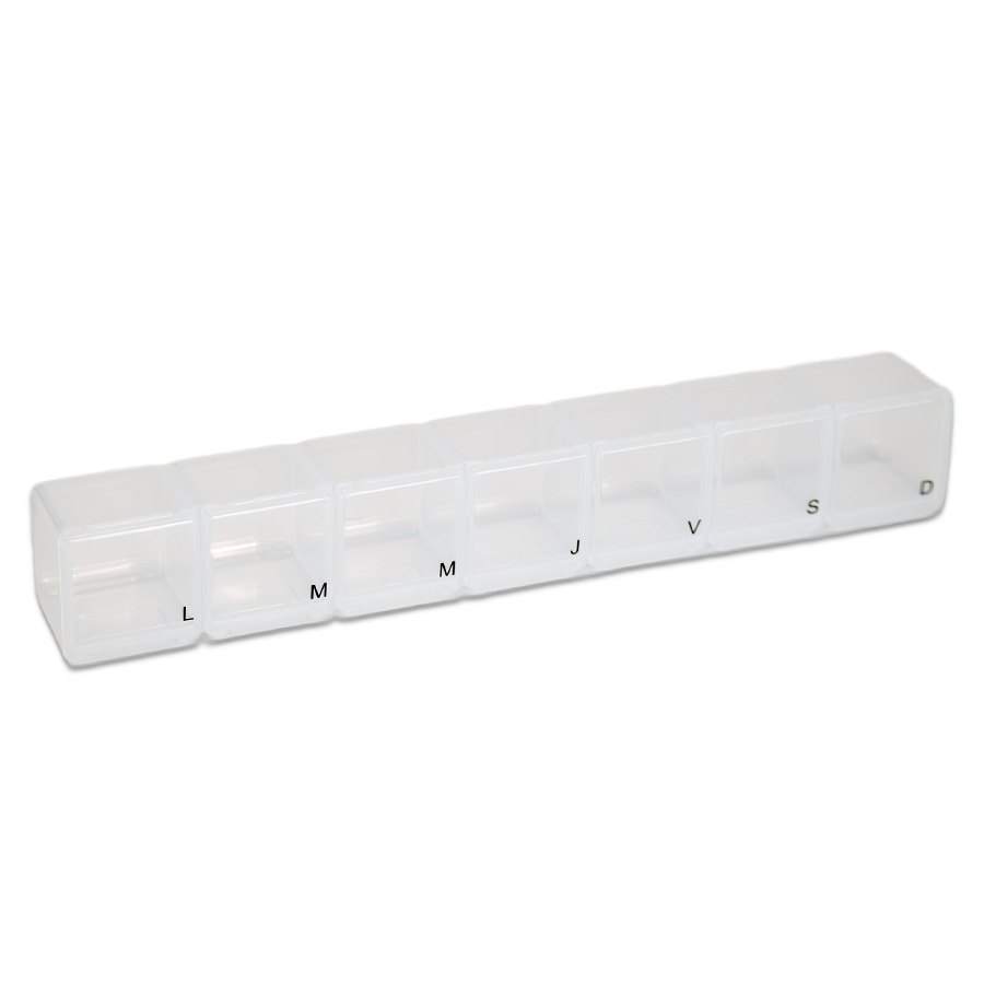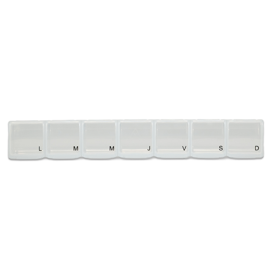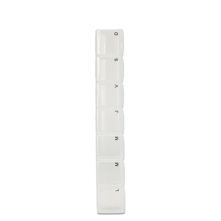 Pastillero Plástico de PVC «TREN», con 7 compartimentos interiores, identificados y ordenados con las iniciales de los 7 días de la semana. Presentación el bolsa blanca biodegradable + caja de cartulina blanca.