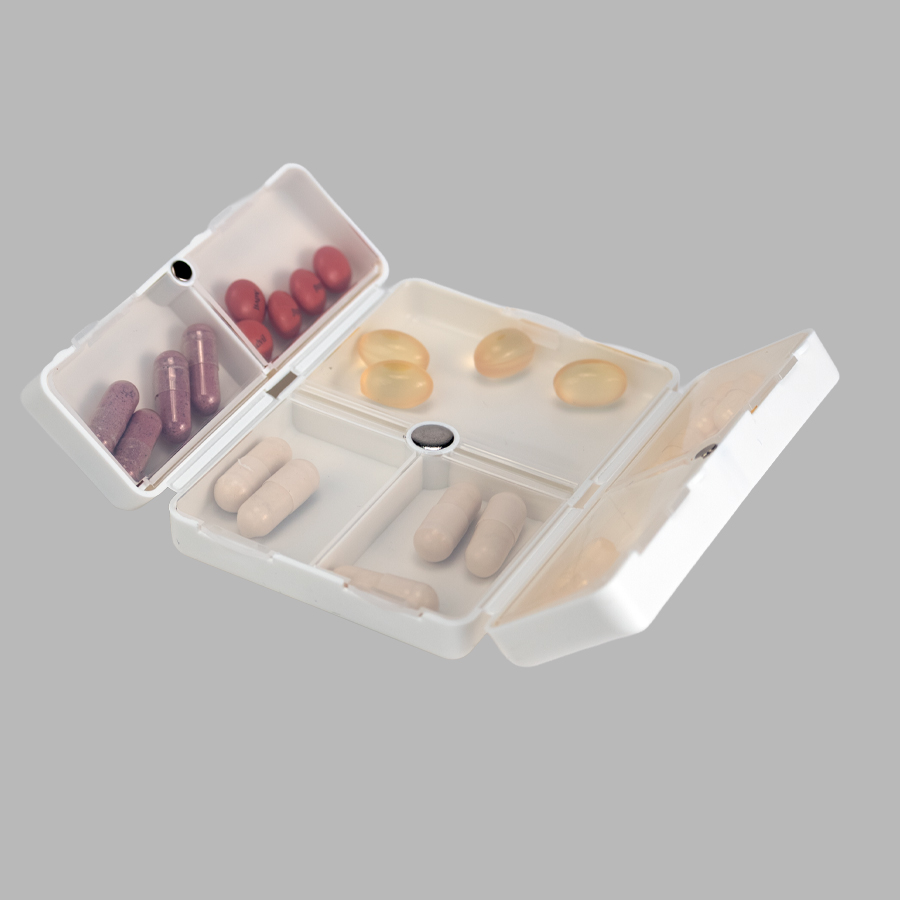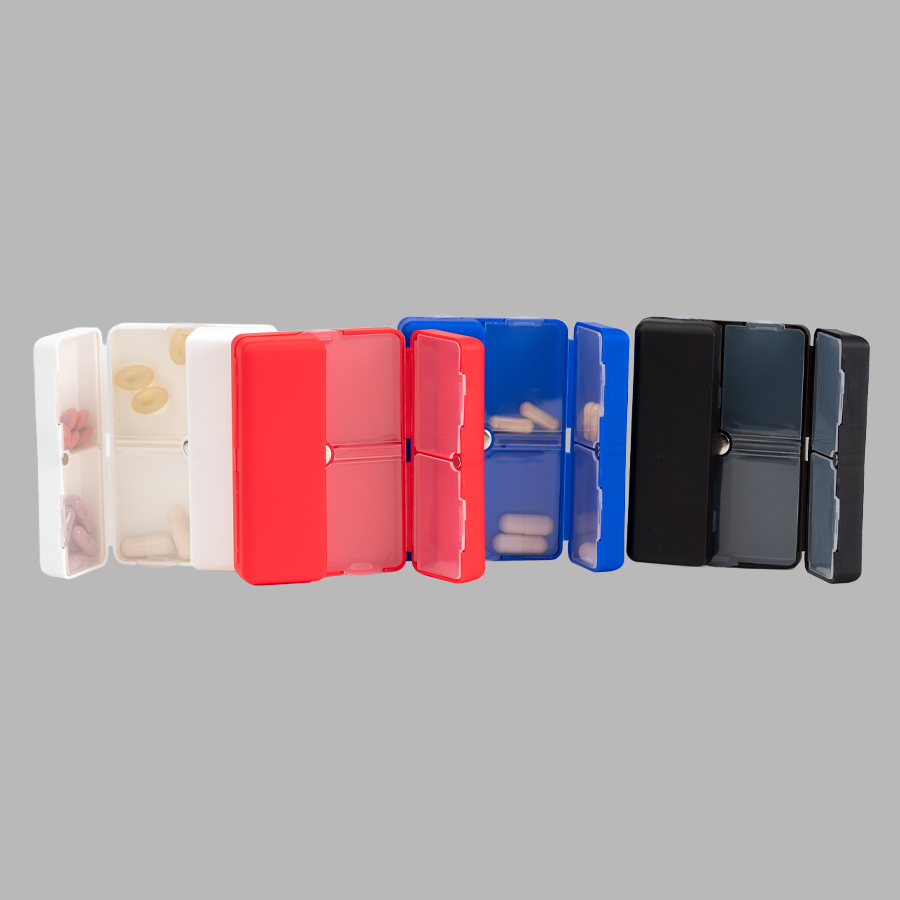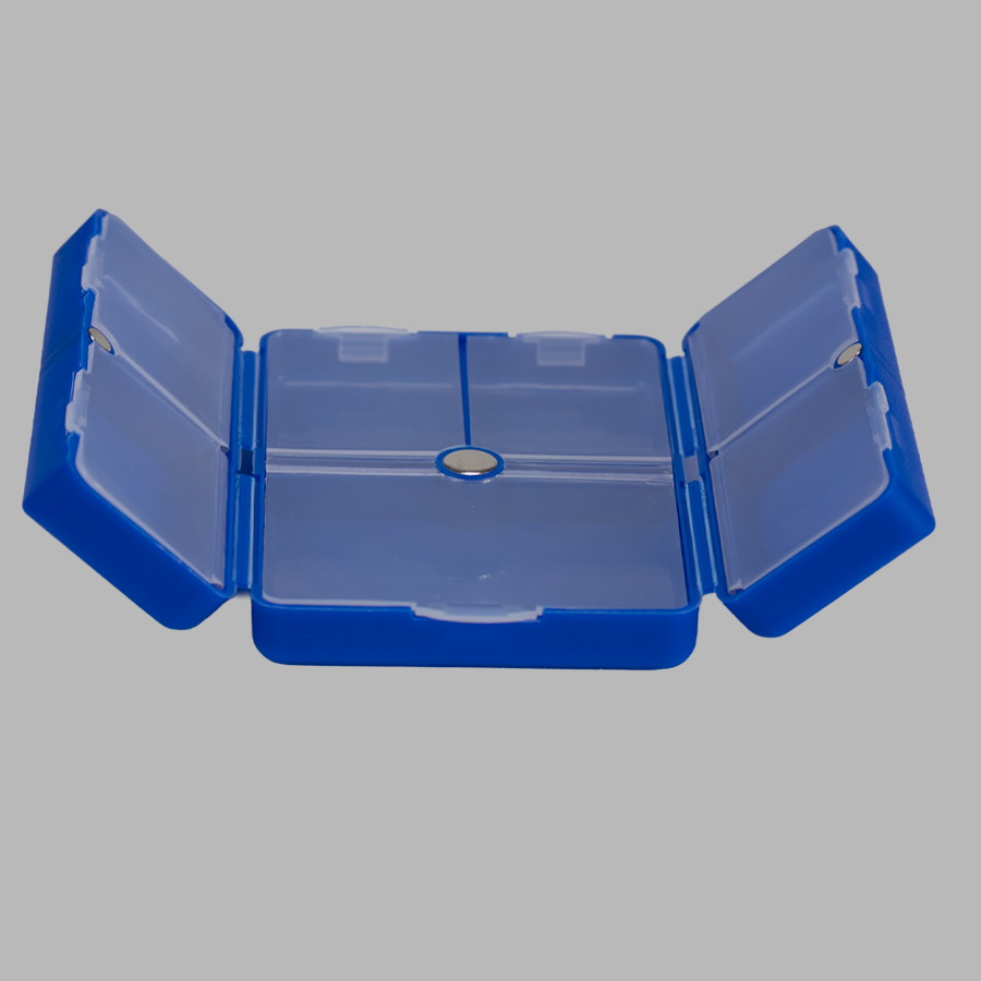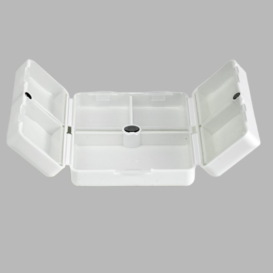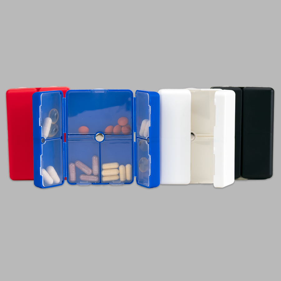 Pastillero semanal «CARE» de Polipropileno (PP). Cuenta con 7 compartimentos interiores de PVC translúcido y apertura doble tipo «libro», con cierre interior imantado. Presentación el bolsa OPP + caja de cartulina blanca.