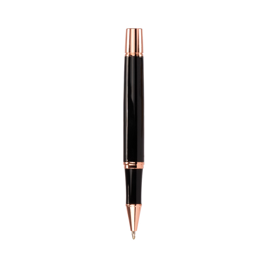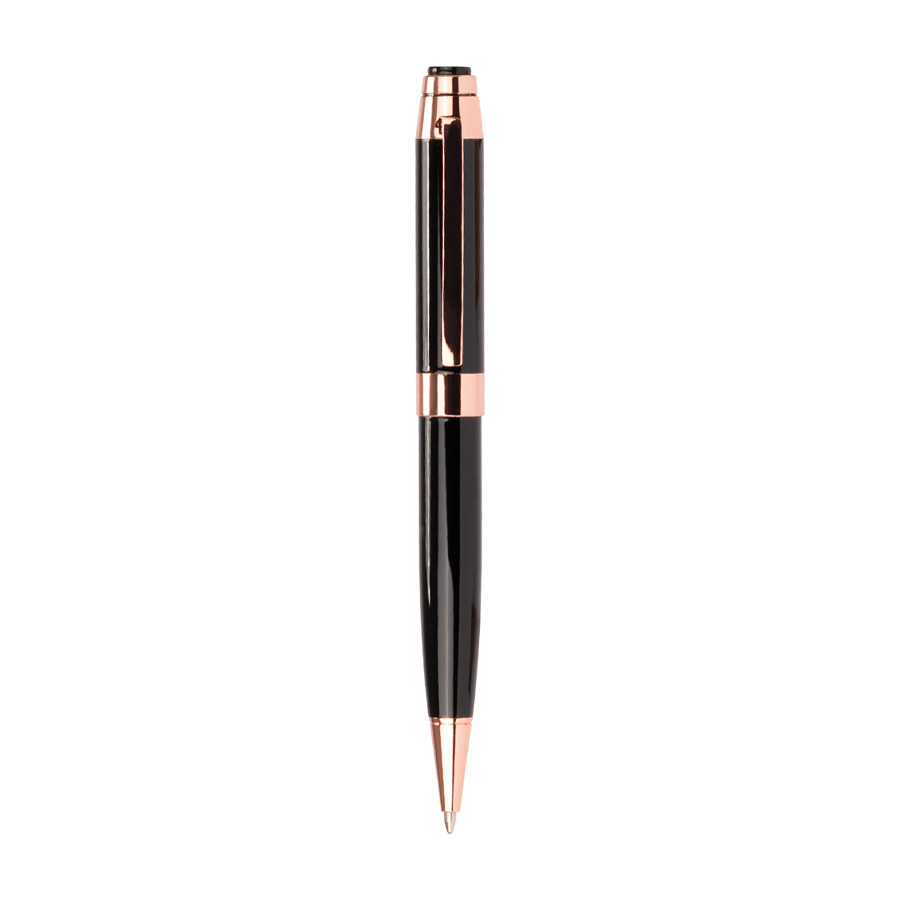 Set de Escritura «THORTON», incluye Bolígrafo metálico negro con terminales encobrizados + Roller pen metálico negro con terminales encobrizados. Presentación en elegante estuche de PU negro con ribete metálico plata opaco bruñido, interior cuna aterciopelada blanca. Sobre funda de papel color negro..