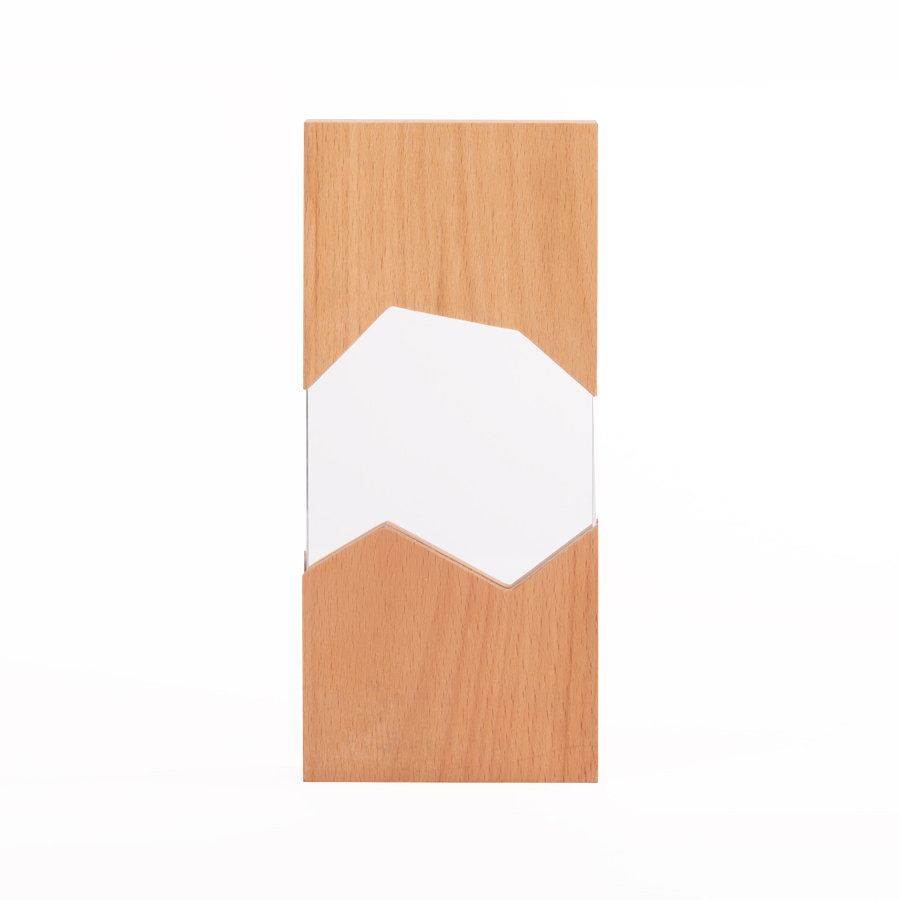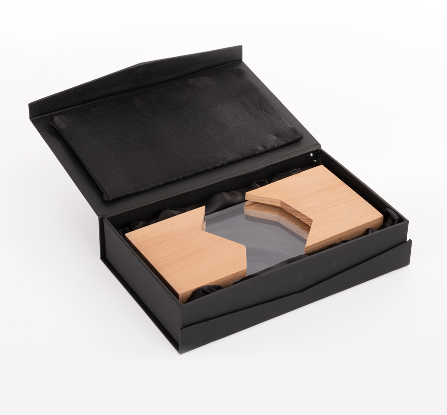 Elegante Trofeo Galvano modelo «Steven», en madera de pino barnizado, con incrustado de cristal en la zona central. Presentación en caja de cartón forrado negro con cierre imantado, interior acolchado de espuma y tela poliéster satinado negro, con troquel.